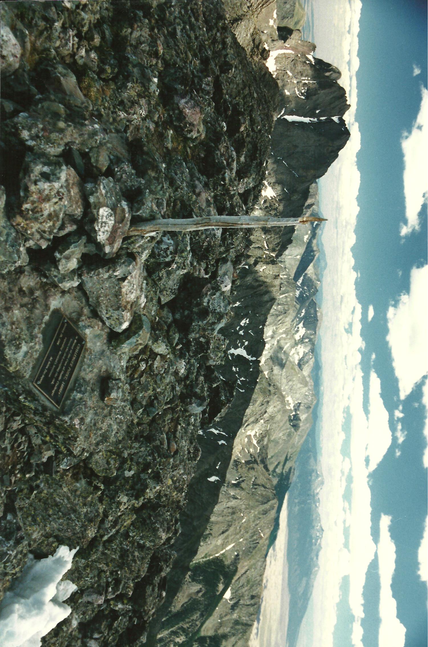 We found and signed the summit register, which was placed in 1985. Dennis Williams was the last person to sign in during 1986, and only about 10 people had done so in 1987. The peak was seldom visited in the past, but will become more famous now that it's named. [By 2017 it was considered a separate Fourteener! And later, not again, because of insufficient saddle drop after precise laser measurements.]