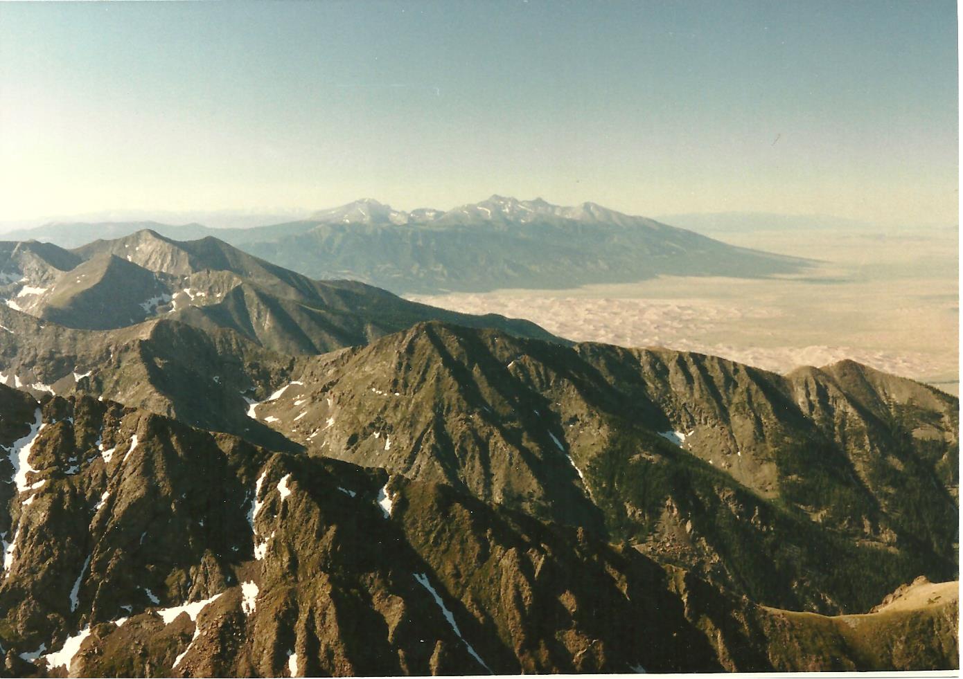 For a short time we soaked up the panorama. Kit Carson dominated the skyline to the southeast, with Crestone Needle and Peak beyond it. To the right, the Sangre de Cristo Range curved around Great Sand Dunes NP to the Fourteeners near Blanca Peak. The open expanse of the San Luis Valley was bordered in the distance by the San Juans to the west. Mount Adams was a rugged pinnacle to the north.