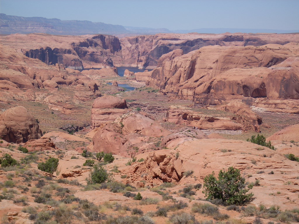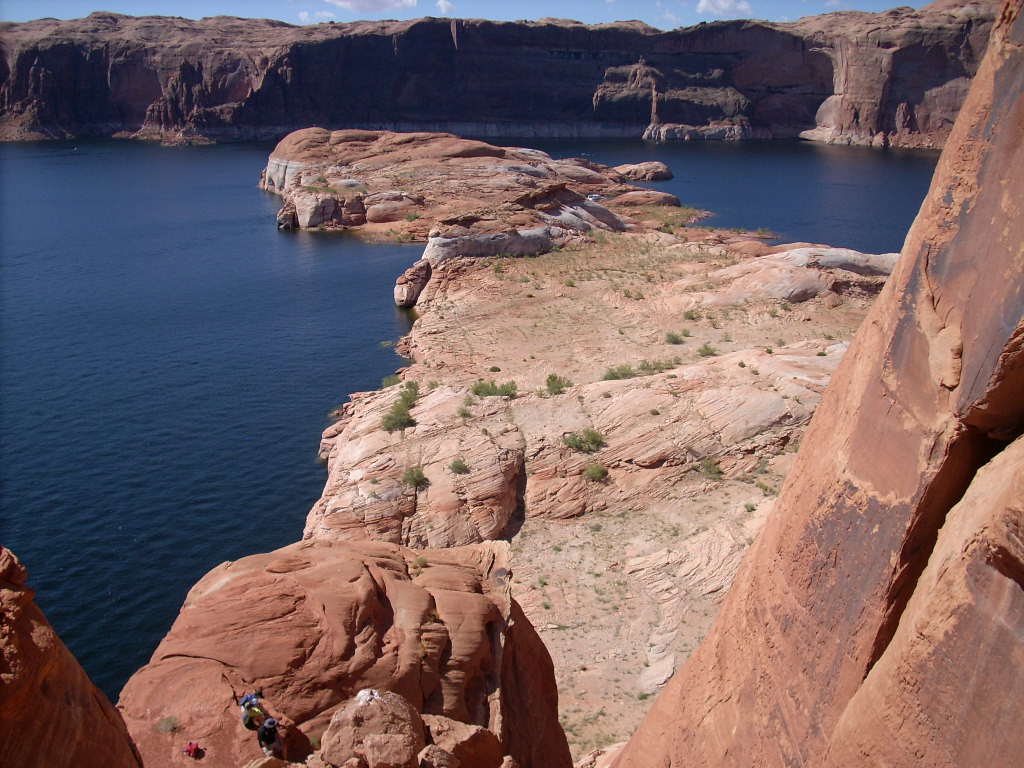 I went as far up the north cliffs as I comfortably could, for a great view out over the peninsula towards Slick Rock Canyon, while the others rested above a lower lakeside cliff below, still probably 150' above the water.