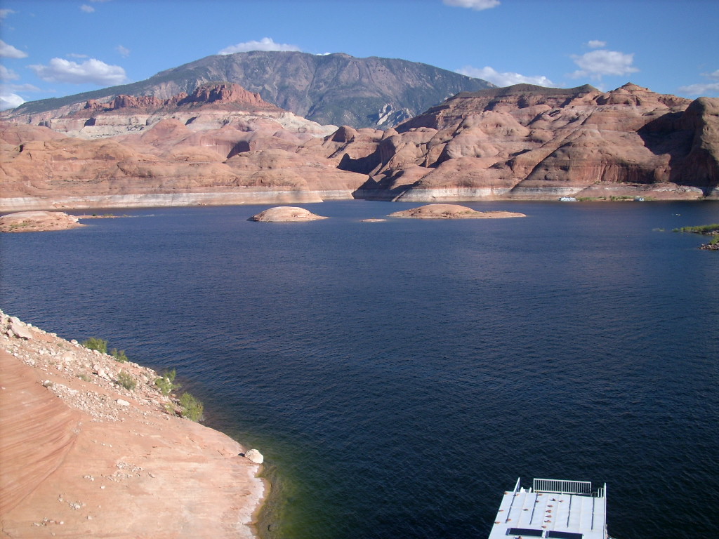 Sunday morning's drive to Bullfrog Marina was unusually spectacular with fall-like puffy low clouds all around. We'd caught the tail end of a several-week monsoon pattern. Gravel side roads were muddy, the desert was in bloom, and the day was blessedly cooler than hotter.