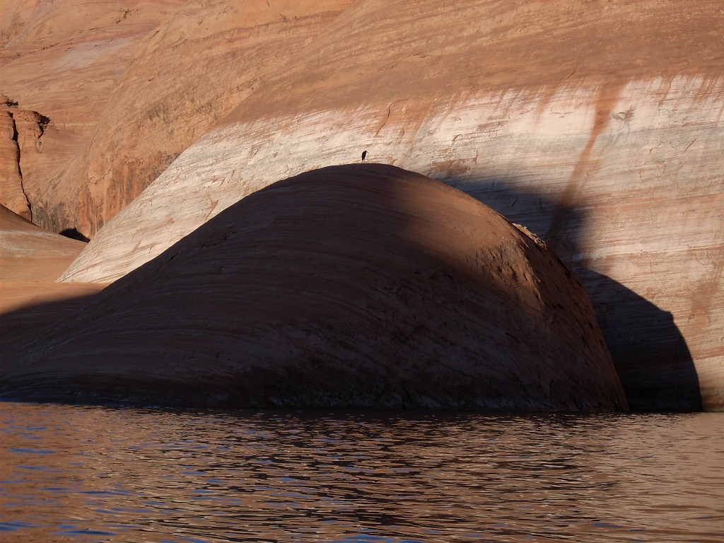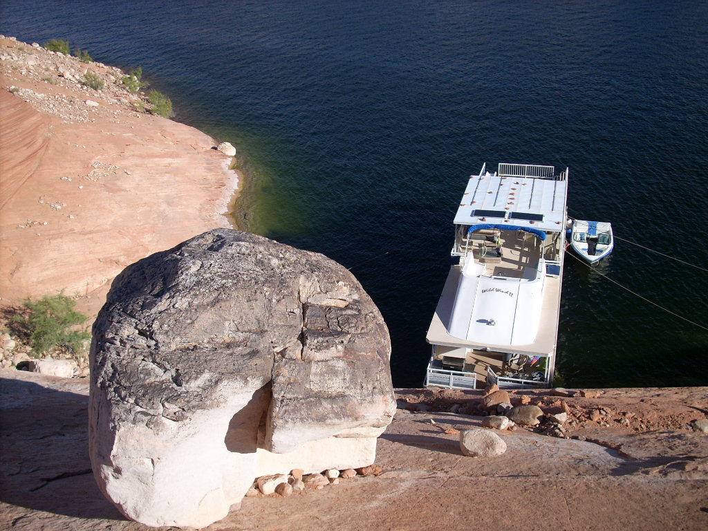 Later we decided to drive the houseboat all the way down to Oak Bay to be near Rainbow Bridge the next morning. I'm sure that as usual we stopped for "evapo breaks" as required along the way, to swim out in the open channel. We made one real stop, at "Moriahs Arch", which in hindsight was ill-advised. This is where the first two mini-disasters (described earlier) took place. Unlike last year, the slightly lower water level meant we ended up pinned (badly) on a huge boulder below the arch, instead of further in, just over the rock and tucked completely underneath the span.