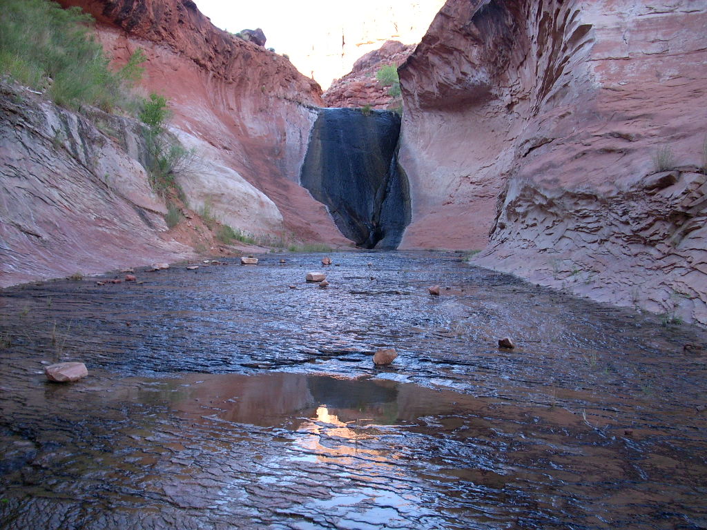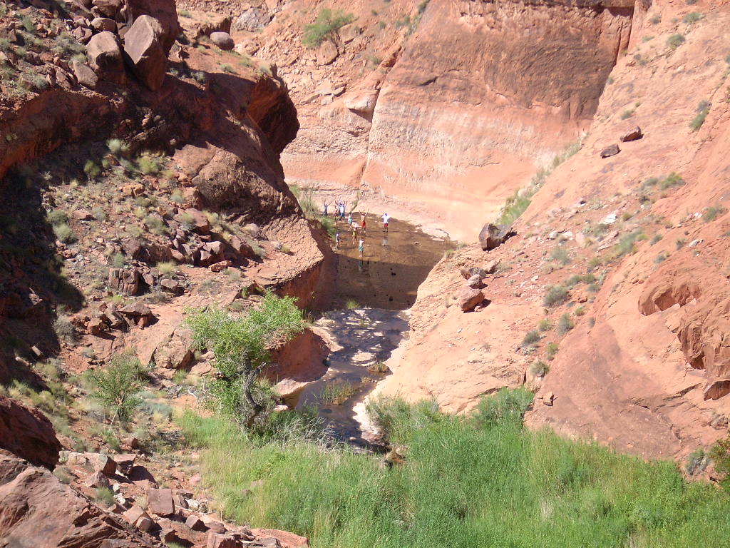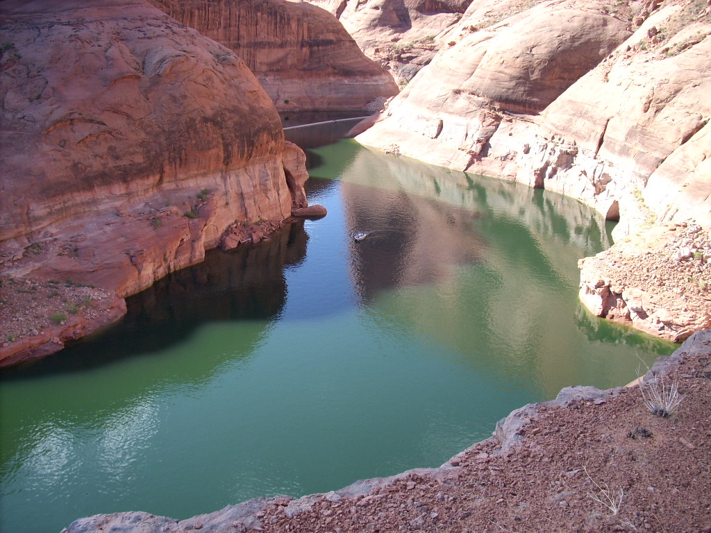 At the mouth of Lehi we were able to step out above the drowned bridges and waterfall for a brief look. Then bemoaning my failure to bring a mask and snorkel, I decided to try diving down to see the bridges anyway. And I found both of them! I touched their saddles, around 15-20' down, clearly visible in the cloudy green water.
