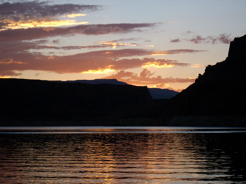 This was a lazy day of mostly houseboat driving. We left Wilson Creek at about 11 am and tied up in Iceberg Canyon (river-right cove downstream of the first right finger) at about 7:30 pm, less than an hour before sunset.
