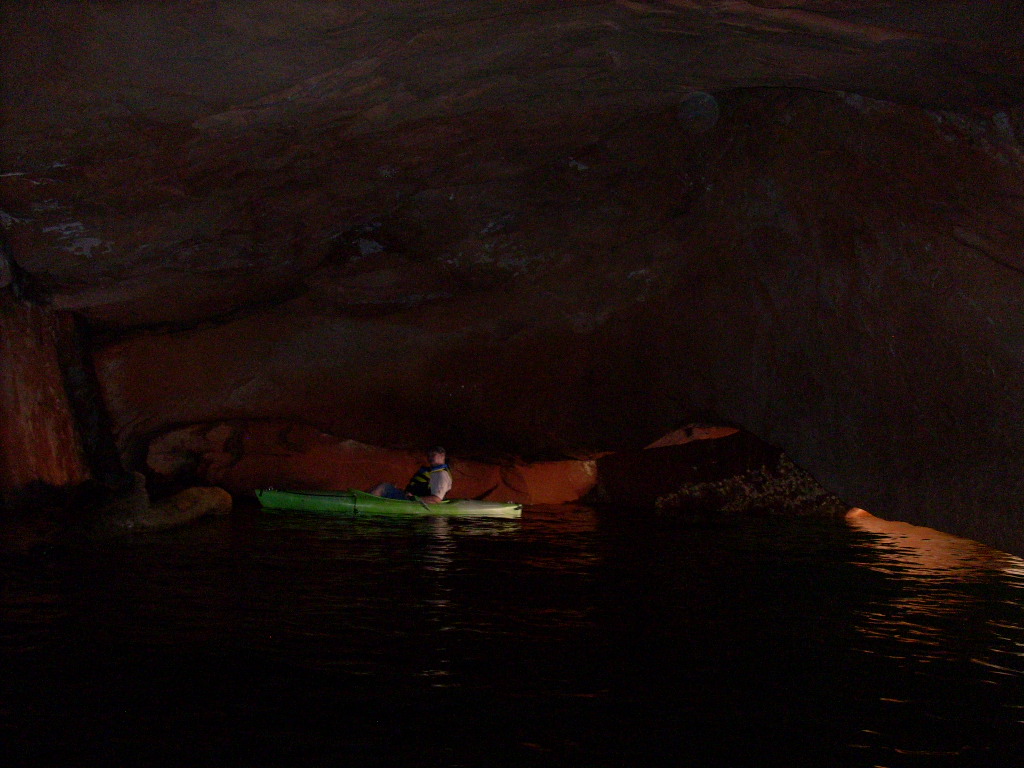Anyway later safely moored up in Iceberg Canyon, there was time to swim over to the "triangle cave" nearby. It was at a perfect water level to explore... A small entrance leading to a huge, high, dark, eerie cavity, complete with an enormous floating log that must have drifted inside when the lake was lower, and gotten trapped.