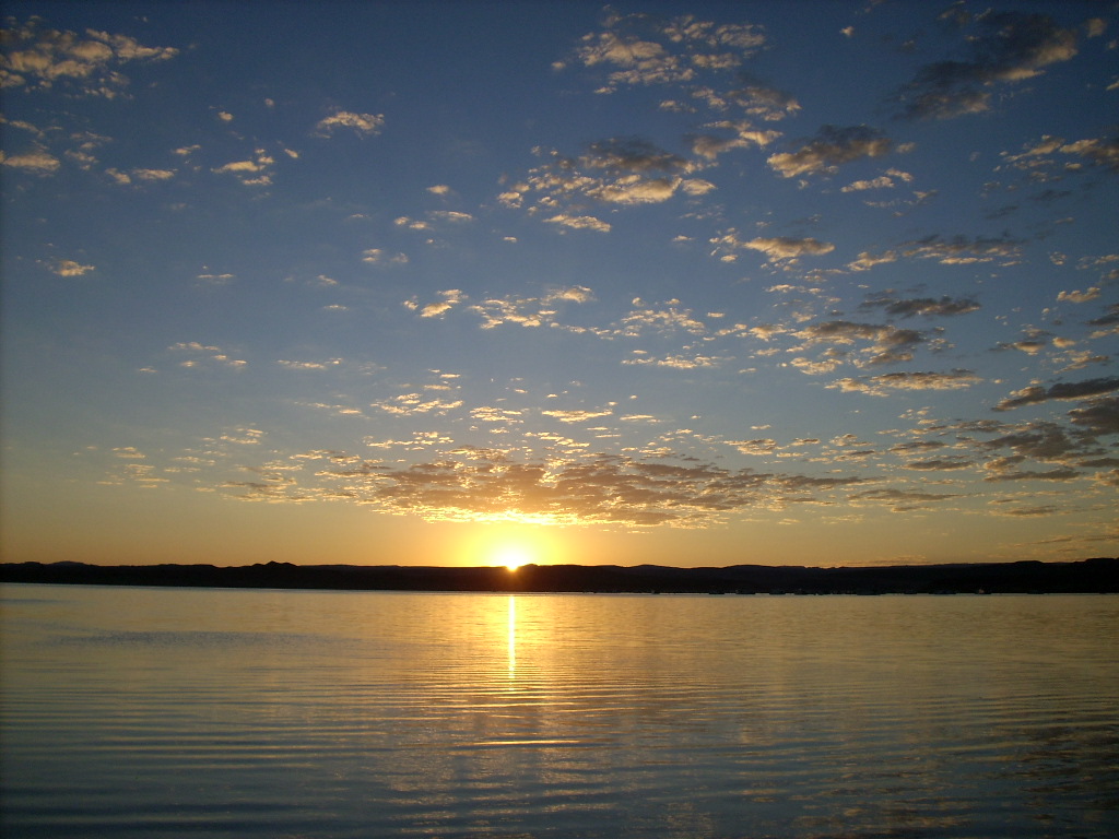 The sunrise was magnificent... Calm, poetic, with many small, low, puffy clouds reflecting off the lake. John went waterskiing one last time and I took pictures. It was beautiful and colorful.